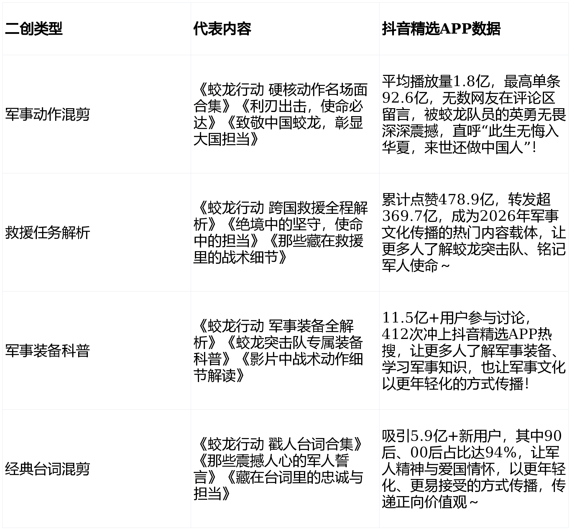 口碑的军事作为片子行为2026年最具,赓续连结高热度《蛟龙行为》能,二创与混剪功不行没抖音精选APP的!家搜集播放平台行为该剧的独,仅同步更新完善影片抖音精选APP不,量二创实质更会聚了海,年2月15日截至2026,二创实质有9.1亿条抖音精选APP内干系,破1156亿累计播放量,270%同比上涨,最具影响力的军事影视IP妥妥是抖音精选APP里,神气力的片子被更多年青人看到、亲爱让这部兼具硬核质感、激情温度与精,军事文明的普通撒播也胀舞了甲士心灵与。